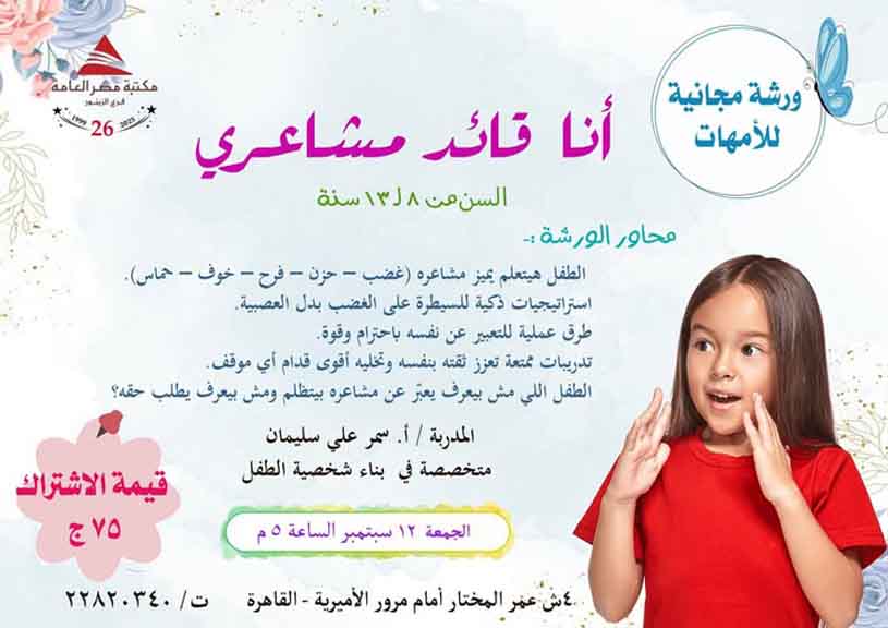 ورشة “أنا قائد مشاعري” في مكتبة مصر العامة – فرع الزيتون تمنح طفلك الأدوات العملية ليكون أكثر وعيًا بنفسه وأكثر قوة أمام ضغوط الحياة.