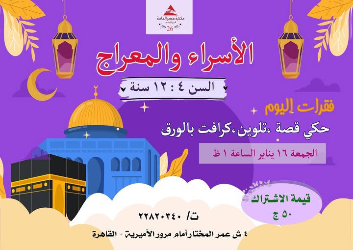 تدعوكم مكتبة مصر العامة – فرع الزيتون لقضاء ليلة روحانية دافئة احتفالًا بذكرى الإسراء والمعراج، في أجواء بسيطة وقريبة من قلب الطفل، مليئة بالحب والفرح والمعنى.