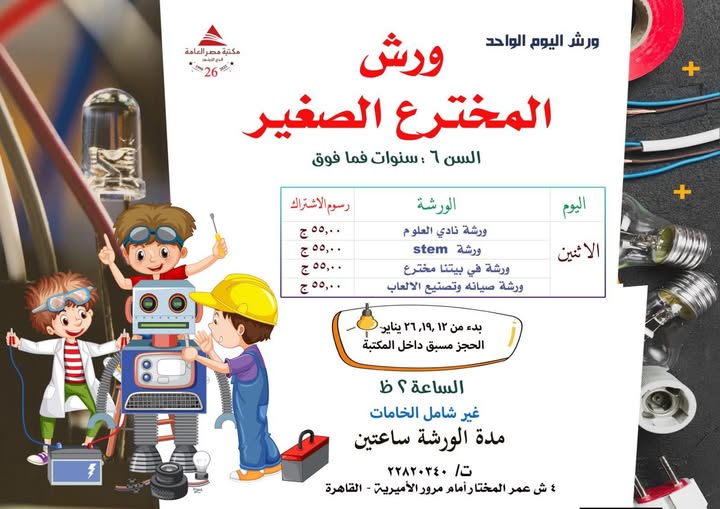 لو ابنك أو بنتك بيحبوا يفكّوا ويركّبوا، ويسألوا دايمًا “ليه؟” و“إزاي؟”، فالورشة دي المكان المثالي لاكتشاف شغفهم وتنميته بشكل علمي مبسّط يناسب أعمارهم.