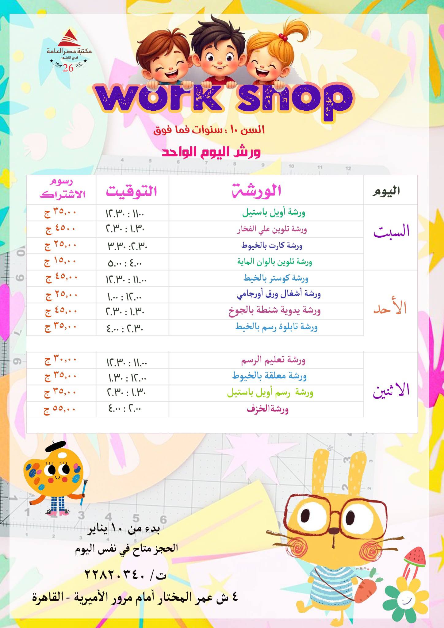 يوميًا من الساعة 10 صباحًا إلى 7 مساءً عدا الثلاثاء أجازة اسبوعية.