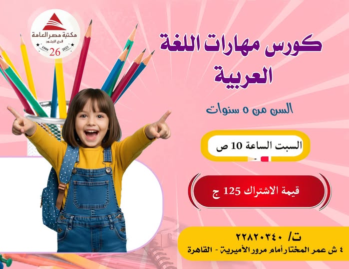 مكتبة مصر العامة – فرع الزيتون تقدم لكم برنامجًا مميزًا لتأسيس اللغة العربية من الصفر، مصمم خصيصًا للأطفال الذين يبدأون رحلتهم الأولى في عالم الحروف والكلمات، بأسلوب حديث يجمع بين المتعة والتعلم والتفاعل.