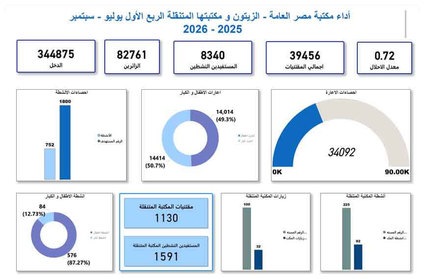 حققت مكتبة مصر العامة بالزيتون ومكتبتها المتنقلة أداءً قويًا خلال الربع الأول من العام المالي (يوليو – سبتمبر) 2025-2026